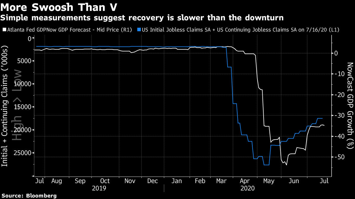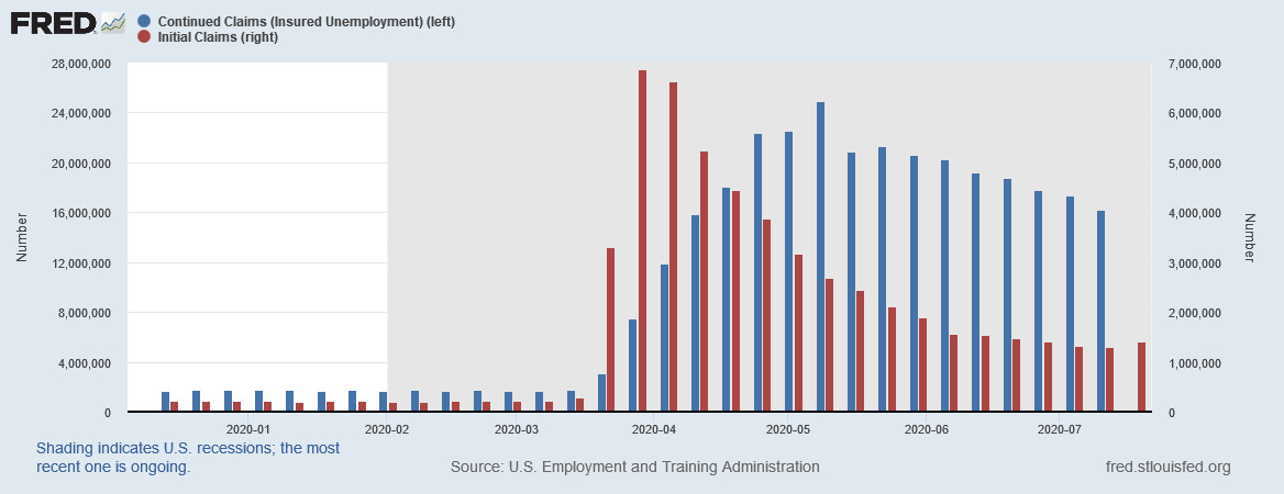 Anfang Mai erreichte die die Zahl der als arbeitslos gemeldeten Amerikaner mit 25 Millionen Menschen (blaue Balken) Werte wie zuletzt während der Grossen Depression. Seither ist die Zahl auf 16.1 Millionen zwar stark zurückgegangen, die wöchentlich neu gemeldeten Anträge auf Arbeitslosengeld (rote Balken) verharren aber immer noch bei rund 1.4 Millionen und sind letzte Woche wieder leicht gestiegen.