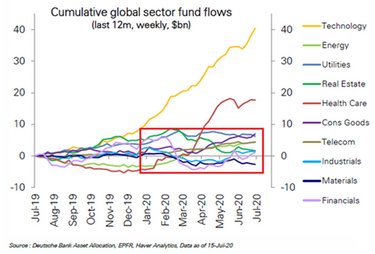 Nun aber zum Aktienmarkt. Wenn man sich die globalen Zuflüsse in die einzelnen Aktiensektoren anschaut, dann ist es nicht erstaunlich, dass die Aktienrally hauptsächlich von Unternehmen aus dem Technologie– und Pharmasektor getragen wird. Deren Geschäftsmodelle profitieren direkt von den Lockdown-Massnahmen während das produzierende Gewerbe sowie die Restaurant– und Tourismusindustrie stark leiden.