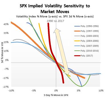 Die rote Linie zeigt, dass eine Korrektur von gerade einmal 2% über drei Tage bei amerikanischen Aktien (X-Achse) ausreichen würde, damit der Volatilitätsindex (VIX, Y-Achse) um über 40% steigt. Am Freitag schloss der VIX bei 11.29 und eine 2% Korrektur im Aktienmarkt würde ihn auf 15.81 „katapultieren“. Der langfristige Durchschnitt liegt übrigens bei 18.62. Im Oktober 2008, während dem Höhepunkt der Finanzkrise, erreichte der VIX seinen Höchststand bei 96.40. Nicht umsonst wird also Volatilität als die am meisten unterbewertete „Anlageklasse“ gesehen. Ein Short Volatility ETF und somit das Gegenteil, müsste man demnach als die am meisten überbewertete Anlage bezeichnen.