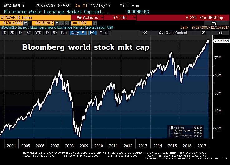 Das Börsenjahr 2017 neigt sich dem Ende zu. Es war ein durchaus erfolgreiches Jahr für Anleger. Weltweit legten Dividendentitel, gemessen am MSCI World, rund 19% zu. Noch besser rentierten Aktien aus Schwellenländern mit einem Plus von 29%. Einzig europäische Aktien, gemessen am Euro Stoxx 50, konnten mit nur 7.6% nicht mit der restlichen Welt Schritt halten. Wer hätte beispielsweise nach der Wahl Donald Trumps im November 2016 damit gerechnet, dass amerikanische Aktien über die nächsten 12 Monate rund 27% an Wert zulegen würden? Ein Haupttreiber der weltweiten Hausse war aber unter anderem genau der wirtschaftsfreundliche Kurs Trumps in Form von Deregulierungen und Steuersenkungen verbunden mit einem anziehenden Welthandel. Ach ja, und natürlich das unermüdliche Gelddrucken der Notenbanken, die so viele Wertpapiere aufgekauft haben wie noch niemals zuvor. Allein die Käufe der amerikanischen Fed, der europäischen EZB und der japanischen BoJ summieren sich in 2017 auf stattliche 1‘600 Milliarden Dollar. Insbesondere diese ultraexpansive Geldpolitik, die ja ursprünglich nur als vorübergehende Massnahme gegen die globale Finanzkrise vor fast 10 Jahren gedacht war, hat  dazu beigetragen, dass Aktien nicht nur immer höher gestiegen sind, sondern dass sie dies auch sehr stetig und ohne grosse Rücksetzer getan haben. Ein anschauliches Bild dessen gibt sich, wenn wir uns den Chart des Weltaktienmarktes näher anschauen. Die Rally des bald vergangenen Jahres verläuft sehr linear und kannte nur ein Richtung: steil nach oben.
