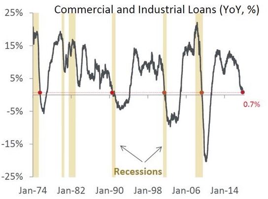 Ein weiterer sehr wichtiger Faktor für das Wirtschaftswachstum stellt die Kreditvergabe dar. Auch diese bewegt sich wie die oben beschriebenen Kennzahlen in einem ständigen auf und ab und es spricht einiges dafür, dass wir uns eher dem Ende des gegenwärtigen Kreditzyklus nähern. Die private Verschuldung der amerikanischen Haushalte und Unternehmen hat längst das Vorkrisenniveau von 2008 überschritten. In China hat in den letzten 10 Jahren ein eigentlicher Kreditexzess stattgefunden, der den privaten Verschuldungsgrad von 114% auf über 210% des Bruttoinlandsprodukts (BIP) katapultiert hat.7 Zuletzt hat sich das Wachstum der Kreditvergaben in beiden Volkswirtschaften stark abgeschwächt. Für die USA hat es ein Niveau erreicht, das man normalerweise nur während oder kurz nach einer Rezession sieht:8