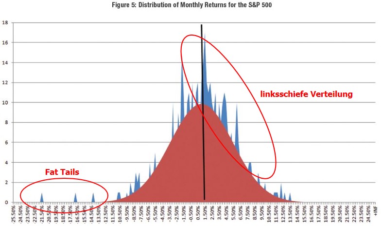 Die Normalverteilung unterstellt, dass wenn die monatliche Durchschnittsrendite bei 1.5% liegt, es immer genau gleich viele Monate gibt, an denen Aktien eine Rendite sowohl von 5.5% als eine Rendite von –2.5% erzielen; die Renditen also gleichmässig (hier +/- 4%) verteilt sind. Wie man der Grafik unschwer entnehmen kann, trifft dies in der Realität nicht zu. (Aktien)Renditen sind nicht symmetrisch verteilt, da zum einen eine grössere Zahl der Renditen über dem Durchschnittswert liegen (linksschief genannt) und zum anderen es zwar wenige aber umso extremere negative Renditen (Fat Tails) gibt, die im mathematischen Modell der Normalverteilung eigentlich nicht vorkommen dürften. Dieser Umstand wird in der Fachsprache als Tail Risk bezeichnet und führt dazu, dass Risiken, die eine geringe Eintrittswahrscheinlichkeit aber eine grosse Auswirkung haben, massiv unterschätzt werden.