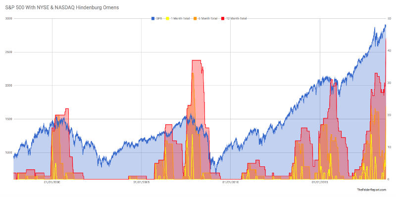 Felder bemerkt, dass über die letzten 10 Handelstage an der NYSE jeder einzelne ein Hindenburg Omen auslöste, was in den vergangen 40 Jahren nie passierte. Über das vergangene Jahr wurden über insgesamt 44 Omen ausgelöst, ebenfalls so viele wie seit 40 Jahren nicht mehr und rund doppelt so viele wie vor 20 Jahren kurz vor dem Platzen der Internetblase.