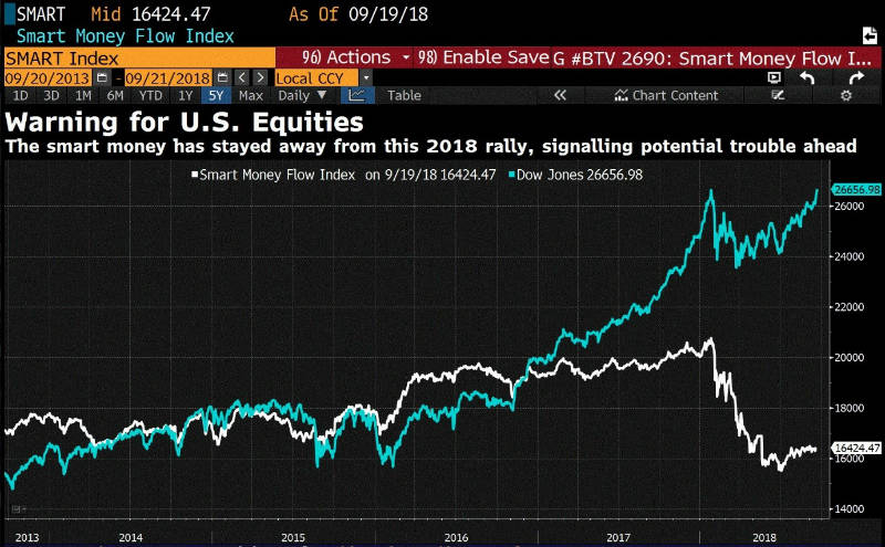 Wann genau dies sein wird weiss niemand. Die Anzeichen mehren sich aber, dass der Tag näher rückt. Die angesprochene Divergenz der Aktienperformance ist das eine. Auch bemerkenswert ist, dass das so genannte Smart Money, also das Geld institutioneller Investoren, seit Anfang Jahr anscheinend nicht mehr an der Börsenparty teilnehmen will: