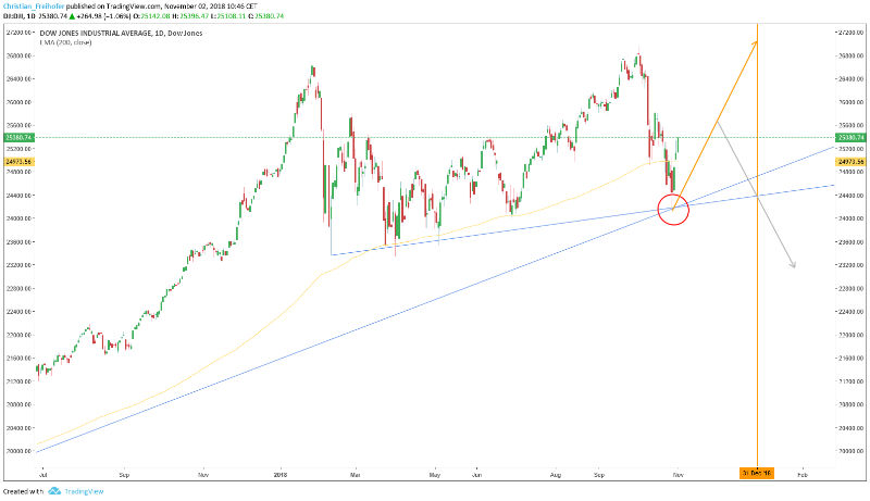 Die Verkäufe kamen (vorerst) letzten Montag abrupt zum Stehen. Die Gründe sind wie immer vielschichtig und nicht genau zu deuten (stark überverkaufte Marksituation, Trumps möglicher Deal mit China, usw.). Wieso auch immer, interessant ist aber die Tatsache, dass der Abverkauf in allen drei amerikanischen Indices an wichtigen technischen Unterstützungspunkten stoppte. Hier der Dow Jones Industrial Average: