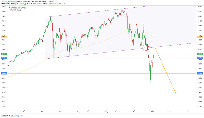 Die Vorsicht hat sich dahingehend ausgezahlt, dass ich mein Longengagement vom 10. Dezember (roter Kreis im folgenden Chart) mit einem kleinen Gewinn schliessen konnte. Gleichzeitig aber wurde ich von der Stärke des Abschwungs, der dann bis auf 2‘315 Punkte reichte, doch überrascht und es gelang mir nicht, den Markt rechtzeitig zu shorten. Stand heute ergibt sich für den S&P 500 folgendes Bild: