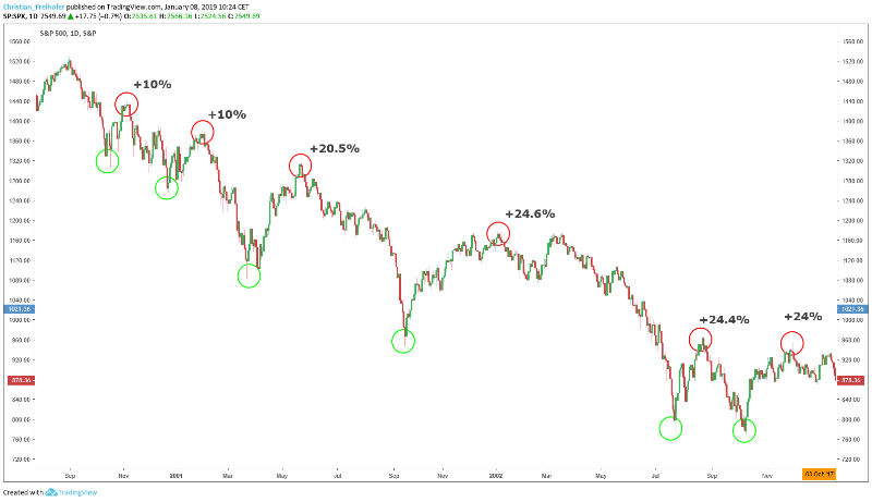 Ich gehe deshalb davon aus, dass wir momentan nichts anderes sehen als eine klassische Bärenmarktrally. Diese zeichnen sich dadurch aus, dass sie in ihrer Kursbewegung sehr stark sein können und die Kurse in kurzer Zeit gut und gerne 20% und mehr steigen können. Der folgende Chart zeigt beispielhaft, wie der übergeordnete Bärenmarkt nach dem Platzen der Technologieblase im Jahr 2000 von mehreren Kursaufschwüngen „unterbrochen“ wurde: