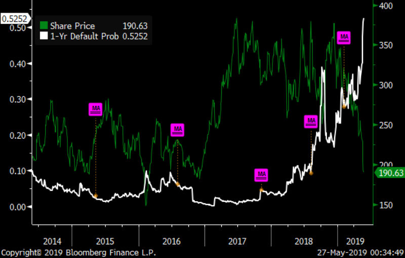 Tesla benötigte also dringend Geld, solange dies der Aktienkurs überhaupt noch möglich machte. Die Preise seiner bestehenden Anleihen waren aufgrund des schlechten Geschäftsganges bereits im Jahr 2018 im Sinkflug, was eine Refinanzierung immer teurer machen würde. Anfang Mai dann schaffte es Tesla auf dem Kapitalmarkt 2.65 Milliarden USD aufzunehmen. Hierfür beschaffte es sich zum einen frisches Eigenkapital von 750 Millionen USD, das durch die Emission neuer Aktien, die zu einem Preis von USD 243 pro Aktie herausgegeben wurden (zur Erinnerung: der Preis steht heute bei USD 190.) Die restlichen 1.8 Milliarden USD wurden über eine Wandelanleihe beschafft, die in Aktien zu einem Preis von 310 USD umgetauscht werden kann. Dadurch wurde ein tiefer Coupon von nur 2% ermöglicht. Rechnet man aber den Wert der Wandeloption heraus, kommt man auf eine Verzinsung von 8.5%. Also ein Zinssatz, der normalerweise für Schrottanleihen von sehr schlechter Bonität verlangt wird.